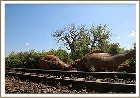 Most recently, two young bull elephants were struck by a train near Mtito Andei. They were attempting to cross the railroad in a place adjacent to where soil is being excavated for use on the new high speed rail that is currently under construction. The steep side of the excavation prevented them from being able to get out of the way quickly enough and they were both struck and dragged for more than 50 metres. The bull elephants were hit at about 2:00am and KWS were on site by 5:00am to remove their tusks.