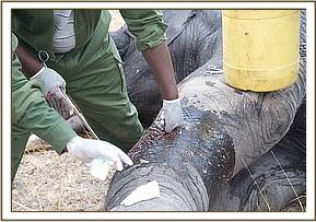 The vet covered his eye with his ear, and poured water over his ear and head to keep him cool throughout the operation. A small stick was placed to keep his truck open to ensure that he could breathe while under the effect of the drug. Ropes were inserted beneath his front and back legs and the car pulled him so that he lay on his right side to allow the Vet to work on the wound.