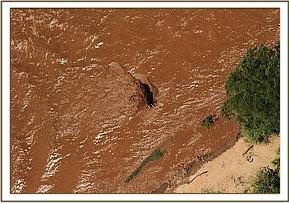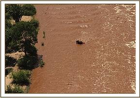 In Tsavo today, 20th November, as the Galana river flooded DSWT pilot Humphrey Carter watched drama unfold when he spotted from the air. He'd spotted an elephant trying to cross the river just as the flood waters began to rise, catching him vulnerable and only half way across the body of water. As the elephants struggled to keep control he made the decision to turn back against the raging torrent, as the flood waters continued to come down in spate and managed to swim back to shore the way he came. Thankfully all ended well as Humphrey circled above hoping and praying the drama that was unfolding below him would have a happy ending. Fortunately it did.
