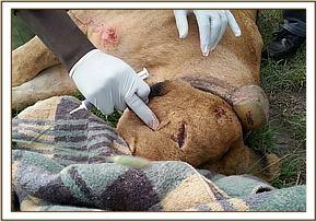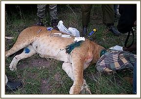 KWS Vet Dr. Fred Olianga immobilized Nelly effectively using a dart gun from a vehicle. The collar was removed and handed over to the KWS Carnivore Liaison Office as the wound would not be able to heal with it in place. Dr. Olianga shaved the affected area and cleaned the wounds with water, iodine, then administered antibiotics finally applying the green clay to help facilitate rapid healing. The anaesthetic was reversed and Nelly was up within 15 minutes to rejoin her cubs. Nelly has been given an extremely positive prognosis and will recover fully.