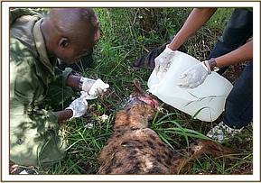 Eventually the hyena was sighted by a KWS ranger and together with DSWT the KWS Veterinary Unit responded rapidly as the hour was late and the light was fading. The animals was darted and the snare clipped away. Unfortunately the damage the snare had caused was very severe and the hyena had been unable to eat or drink for many days, which had left it very emaciated. Sadly, the hyena passed away peacefully whilst under anesthetic and we can only be thankful it was finally free from suffering.