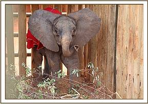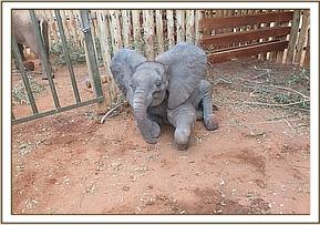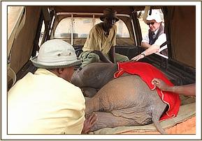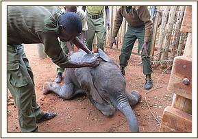 The sad decision had to made to take the calf from her mother as clearly she would not have survived the night and it was clear for all to see that serious veterinary intervention would be necessary for any hope of recovery. The calf was therefore driven in the late afternoon to the Voi stockades in Tsavo East National Park and was put into the taming stockade next to where Mbirikani has been making her recovery. There the new calf stood immobile, unable to move without falling over, but she did take both milk and water, and was clearly comforted by the presence of Mbirikani next door.
