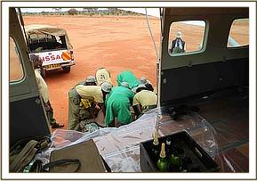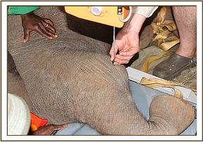 Arriving at the site on Sunday 21st July 2013 the vet unit found an 8 month old female elephant calf which was crawling on the ground to keep close to her mother, her front foreleg swollen three times its normal size whilst her hind leg on the same side was limp and useless. The baby had clearly suffered a dramatic trauma. Ones immediate reaction pointed to a possible collision with a vehicle, but on closer inspection there was no indications of this, such as bruising or lesions on the rest of the body.