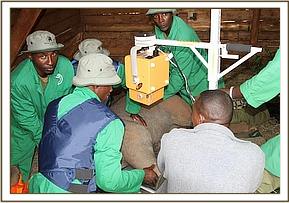 The next day she was airlifted to Nairobi where an x-ray machine, kindly donated to the DSWT, was used to assess the calfs internal injuries. Surprisingly to all the hugely swollen front leg appeared clear of any obvious break, yet the femur of the back leg was snapped in two. The break was so extreme that any hope of recovery was absent, beside which the suffering of this calf was so severe that even the elephant Keepers, for the first time ever, wished that she be put out of her pain. This decision was not taken lightly and came with a lot of advice and support from different veterinarians and specialists. So with a heavy heart, little Duruma, as she had since been named after the area in which she was found, was laid to rest. The reason for her terrible injuries were never clear and will remain forever a mystery.