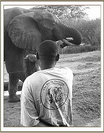 Edo had a lactating older sister and although his gentle mother allowed her grand-daughter to occasionally suckle from her, the sister would not allow the same concession to poor Edo, who was just 6 months old and fully milk dependent when his mother died in l989. He trailed the rest of his elephant family for several weeks, growing consistently weaker through milk deprivation, spending long periods asleep and then having to catch up with them later.