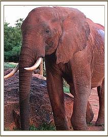 Also in the Nursery at the time were Dika (A Tsavo orphan born in l988), Ndume and Malaika, (both born in l989 from the Imenti Forest) and several younger babies. The older orphans were brought to the new arrival and they surrounded him, touching him with their trunks, and rumbling a greeting. Edo opened one bloodshot eye, and was visibly astonished at what he saw - Dika slurping down a bottle of milk with audible relish. Amazingly, Edo immediately came to life and struggled to get up, which he managed with the aid of the Keepers. Standing on wobbly legs, he watched Dika and Ndume down more bottles of milk, and when one was offered to him, he followed suit. We could see him literally gaining strength before our very eyes. He even managed to follow the other orphans to the noon mudbath, and although he refrained from going in, waiting on the sidelines, he was quite calm amongst the visitors, quite used to human company since the Scientists had monitored him and his family from the day he was born. However, also in the Nursery were two young rhinos, Sam and Amboseli who were always accompanied by “Boozie”, the sheep who had been Sam’s constant companion until the arrival of Amboseli, some months later. Edo obviously linked Boozie the sheep to hostile Masai tribesmen, who were in the habit of spearing elephants when they competed with their cattle for water in the Park. He was terrified of her!