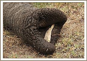 At 9.00 am a report was received about a bull elephant that had been sighted at the Stockade with a spear wound to the right shoulder. The elephant was in a group of 11 wild elephants.