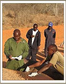 Neville guided the helicopter to the correct group of elephants and in no time Dr Poghon had a dart in the elephant. It was a big bull, with a broken left tusk and very strong. It took nearly 20 minutes for the elephant to succumb to the drug