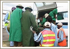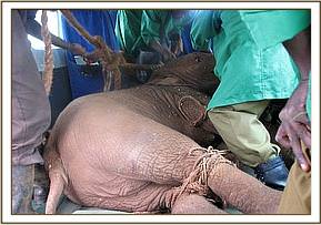 Having alerted the resident Kenya Wildlife Service officer, they began to dig a deep sloping trench so that the calf could exit the hole, a task that took several hours before she was within reach. She was helped out, very stiff and sore, and her legs roped before being loaded into the KWS Pickup and driven to the Park base, a journey that entailed another 4 grueling hours over bumpy roads. At base, she was housed in a vacant horse stable, but by the time we received news that a rescue was needed, it was again too late to organize a plane that day. Nor was a plane available the next day until 11 a.m. but in the meantime we issued instructions by phone that the little elephant be given no milk, but only water. Our Keepers left Nairobi at noon, with all the usual rescue paraphanalia, armed with formula milk, rehydration salts and a loaded syringe with the first of what will be a five day course of prophylactic anti-biotic to try and protect her from the dreaded pneumonia. Although her physical condition was not bad, the left side of her body was very bruised, the left foreleg swollen at the joint and the left hind leg so injured that she could put no weight on it. However, following examination by the Vet, it is thought not to be broken, but there has obviously been extensive tissue and tendon damage to both limbs. Her head was also badly bruised and bashed, and one ear has a large tare.
