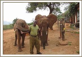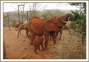 Meanwhile the Keepers had returned to the Stockades to collect some of the dairy Cubes that had been sent down for Edie, and equally as importantly, to pick up Keeper Misheck Nzimbi, the favourite of all the elephants, and a man who had known Emily from the day she arrived in the Nursery. They then all returned to Emily and her calf below the Voi Safari Lodge, where Misheck was greeted warmly. Emily then feasted on the cubes and copra cake (Coconut) before the long and laborious journey back to the Stockades began – a journey that took her and the Keepers 6 long hours to cover a distance of just a few Kms. because of the weakened state of little Eve who needed to rest frequently during the process, so much so that the Keepers feared she might collapse and die without making her first birthday. But, eventually, they made it, and there Emily was fed and watered and was reunited later unit with Edie and her baby who returned that day to the stockades as had become the recent patter, as well as Mweya, Irima and Morani, plus Lesanju’s group, 9 of the newer new ex Nursery inmates embarking on the same journey back into the wild system where they rightly belong. Since all the orphans look upon themselves as one large extended family, the greetings, as always, were touching and warm, Lesanju’s group of newcomers embraced simply as additional family members.