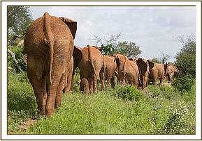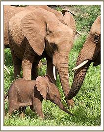 For us the 11th December 2008 was a very special day, for it was on that day that we learnt that Emily, the erstwhile Matriarch of the Voi Unit, had given birth to a baby on a rocky kopje not far from the Stockades. Emily (now 15 years old) had not been seen for three months, simply living amongst her wild peers in Tsavo East National Park. We suspected, however, that her first baby was imminent, the Keepers having witnessed her being mated by a wild bull 2 years ago. During their daily routine patrols they had been on the look-out for her and during the evening of the l0th December, they were rewarded. Standing under a tree on a rocky kopje not far from the Stockades, attended by two adult wild cows and surrounded by members of her orphaned family, was Emily. The Keepers were delighted to see her again after such a long separation, and know that she was safe and well, but any closer inspection was firmly rejected by the two wild cows, who sent the human family on its way with a spirited and determined charge.