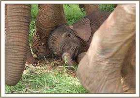 During the next four days, the adult midwives left, and on the 5th day Emily brought her baby to the Stockades to show it to her human family. It was still lovingly attended by all the other female orphans who were with her, while some of the orphaned bulls were keeping their distance, simply tagging along, probably quite confused about the little object causing so much excitement. Emily herself could not have been more relaxed, seemingly confident and happy to entrust the close supervision of her newborn to the host of eager “Nannies”, all of whom were attentive to its every move. The baby ran in and out of a forest of legs, and under large elephant torsos, and gave a spirited miniature charge at the Keepers, its little pink ears standing out at right angles to its tiny head! Edie, in particular, was acting as the main Nannie and was in a high state of anxiety over the welfare of the baby, far more so than its own very relaxed mother!
