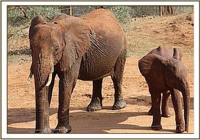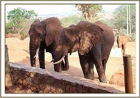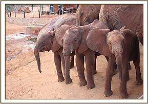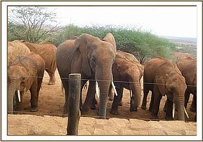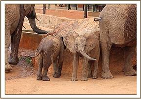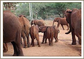 Exactly a week later on the 11th of November, the rest of the Ex Orphan herd including Emily, her calves Eve and Emma, Edie and her calf Eden, Sweet Sally and her little boy Safi, Lolokwe, Siria, Taveta, Mweya and two wild bulls were spotted at the Park entrance on the wrong side of the fence. They too had missed the corridor under the railway and had followed the fenceline to the Park entrance where they seemingly stood awaiting some assistance! A section of the fence was opened for them and they made their way straight to the Voi Stockade and their awaiting human family. When they arrived the adults hungrily set upon some fresh lucerne laid out for them, whilst the Keepers watched Emma, Eden and Safi running around in very apparent good health, chasing one another around the compound.