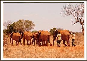 On the 17th of October, while on a regular fence patrol, the David Sheldrick Wildlife Trust (DSWT) Works Manager came across some of our Ex Orphans feeding on parched grass looking extremely hot, hungry and thirsty. It was Lempaute's Ex Orphan herd and as they were only 6km from the Voi stockades the decision was made to walk them back to where water is plentiful and a fresh load of Lucerne had just been delivered from Nairobi. This dry season has lapsed into drought conditions and while we are confident the rains are just a few weeks away we are working tirelessly to keep both the wild elephants and our own Ex Orphans provided with ample water with the Trust funded and managed 10 borehole installations throughout Tsavo, all of which are serviced and maintained ensuring the wild animals are not without water.