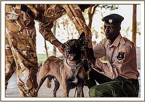 Four year old Max bounds through the dense commiphora bush, typical to Tsavo along with Tsavo’s rust red soil. His playful mood swiftly turns to keen determination as he catches human scent after being ‘cast’ by his handler across a wide area. Straining at the leash and brushing off the thorns of harsh scrubland that scuff against his side, he guides Minor along the invisible scent path only he can detect, up rocky kopjes and through the bush for countless kilometres until he finds his target, another handler hiding beneath a tree out of sight from the DSWT aeroplane that circles above. At the end of a successful track. even in this simulated circumstance, he receives his most coveted reward, his ‘kong’ toy, also used in training back at the compound. His resting temperature is taken, as well as the ambient temperature and humidity level to make sure he is within a safe working temperature range in the hot and arid environment. This simulated training exercise is essential, for both handler and dog, in order to be ready for a real life situation when they encounter illegal activity within the park. It is also vital training to make sure they are capable to keep up with a poacher on the run. Training can be across 25km of terrain to simulate a real life scenario.