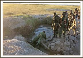 Travelling along rough and bumpy roads, the Amboseli Vet Unit, headed by KWS Vet Dr Ephantus, met the Security Team, who had remained in the area watching over the calf, at 6:45pm. The mother was nowhere to be seen but the Vet Unit presumed she had not gone far and set about hauling her calf, who was floating in the water hole, to safety with the help of five men while two more remained on watch.