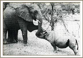 With time, the name “Pushmi” became corrupted to “Hoshim”and it is as Hoshim he is known in Solio. For a rhino anything that tickles is divine, and Hoshim found that Eleanor’s tickle was far better than that of the chickens. He was not in the least bit awed either by her size nor by the fact that he was surrounded by a curious throng of assorted other animal spectators. He simply lay there with his eyes closed, exposing his tummy and sighing contentedly. Eleanor obviously approved. She decided to have a game with him similar to the one she periodically played with Stroppie. Very gently she placed an enormous foot on top of Hoshim’s head, exerting a little pressure, which resulted in an immediate reaction! He leapt to his feet with the whites of his eyes showing angrily, spun round with a terrific snort, tossing his head up and down as he confronted her. Eleanor was surprised as she towered over him, her ears outspread like two gigantic sails. At first she was somewhat puzzled, but then, hesitantly, out came her trunk again. Feeling the tickling starting once more, Hoshim rolled over on his back to make the most of it all over again and it was thus that he became accepted into Eleanor’s orphaned herd!