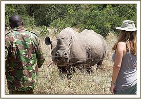 Ed Parfet, the son of the original owner, had warned me the previous day that KWS had removed Hoshim’s beautiful horn. This came as no surprise to me. Also that as an elderly rhino of 37, he was sometimes inclined to be a little grumpy, and in fact had learnt how to break through his enclosure in order to investigate the area beyond, retreating back to his patch whenever needed. He had apparently been startled by one of his Security Guards earlier in the year and had charged him, causing the man to fall and break an arm. I decided to remain within the confines of the car when we met, and Angela , who was more agile, went to feed him his hand-out of sugarcane!