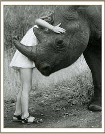 “Pushmi”, as he was originally named, was born in l971, and abandoned newborn by his mother when a tourist Minibus rounded a corner in Tsavo and startled her before the baby had managed to even suckle. In fact, he would have made a morsel for a lioness had the Minibus not arrived in time to save him, for it so happened that a lioness was eyeing him hungrily from a nearby bush as the Driver of the Bus loaded him into the MiniVan. He was dumped on our doorstep still shrouded in foetal material, and he thrived from day one on a formula of humanized Lactogen full cream baby milk powder. Every week David and I would hoist him up in a sling and weigh him and since he was the first rhino we had hand-reared from the day he was born, we were delighted to find that he was gaining weight steadily and rapidly at about 1 lb. per day!