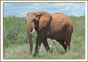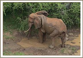 Returning the next morning the immediate area surrounding his last sighting was checked, then again the riverine woodland nearby. Still nothing. Checking the other side of the river soon yielded results, as he was sighted throwing mud on his wounds from a waterhole surrounded by dense vegetation. The brave and fearful male had crossed the red torrent of the Athi River, swollen from upcountry rains. He was easily identified from the air with his sole left tusk and pronounced backbone caused by the loss of condition from his injuries.