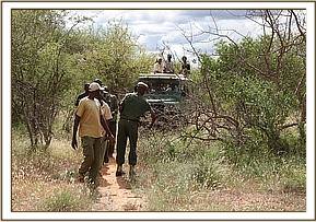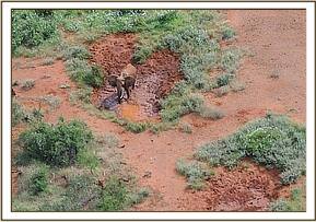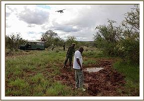 Early in the morning of the fifth day he was sighted again. He had moved further away from the river up a seasonal river system and was drinking and again throwing mud on his wounds. All were ready to give it a second try. He was sighted again at three separate times that morning, including once by Dr Poghon himself enroute to the Tsavo Safari Camp airstrip in an effort to avoid yet more punctures. It look less than two hours for Dr Poghon and the ground team to cut a road in, but he was nowhere to be found. He had vanished again!