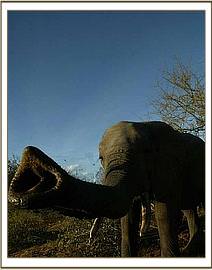 He has fun charging and chasing off the following animals - a jackal that approached the Keepers who were sleeping near him, a pie-dog which looked as though it might be rabid, and warthogs on a regular basis who often come to his noon mudwallow, but allowed two to wallow alongside him on the 22nd April. He has also chased off baboons, tried to down a tree that a wood-pecker was busy working, yet grazed peacefully with a group of impalas. He was seen off by a group of zebras intent on a drink, who joined forces to expel him with a “hissing sound” (according to the Diary) and throughout Imenti always wallowed “wonderfully” and “enjoyably” on all but cool days.