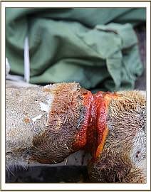 After first approaching in a vehicle and confirming that the lion was properly anaesthetized with a prod from his dart gun, Dr. Poghon was satisfied and immediately got to work removing the snare. Had it been a wire or cable snare, the damage might have been much worse, but the rope had still dug deep into the leg, severing one tendon in the process. The paw was very swollen and obviously in a lot of pain, emphasizing the strength of this lion to still be able to bring down two buffaloes in 4 days, unassisted. Once the wound was cleaned, and the lion had been given antibiotics, Poghon was happy that the wound would heal. The paw will lack full dexterity due to the tendon damage, but it should still be functional.
