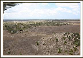 With the lion attended to, the plane continued on to Amu Ranch, where DSWT supports the Lamu Conservation Trust in protecting over 60,000 of pristine coastal habitat. In the absence of aerial coverage, the ground teams have done an exceptional job of keeping illegal activities at bay. Only one small cattle boma was found and a relatively small number of cattle. No evidence of logging — a common sighting a few years ago — was seen anywhere on the ranch. What was evident, however, was the severity of the drought that has been afflicting the region. Several dried up waterholes were seen with the dried up remains of dozens of hippos and buffaloes that got trapped in mud as the last drops of moisture evaporated. Very little grass remains and so far the rains, which were expected in March, have only reached one small corner of the ranch where a few waterholes are attracting the remaining herds of buffalo and topi. Elsewhere, the biggest water pans and estuaries are still parched and desolate. Lamu Conservation Trust is providing water for the wildlife near their headquarters from a borehole, but even this water is slightly salty in the absence of rains. If the rains fail completely, the situation will be catastrophic. Mwalimu Baddi, from LCT, explained that around 160 hippos have so far died of thirst or starvation, many of which drank seawater in the mangroves out of pure desperation.