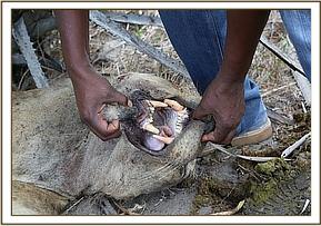 Kipini Conservancy lies just north of the Tana River delta, where Kenya’s largest river empties into the Indian Ocean. Recent rains upcountry have transported millions of tons of red-brown topsoil downstream, so the Tana’s discharge painted dramatic scenes along the beautiful, undeveloped coastline leading up to Kipini. The airstrip was difficult to find, but with some help from Fuzz Dyer, local pilot and owner/manager of Manda Bay Lodge, Neville (pilot) and Dr. Poghon were able to find where the strip had been carved out of a doum palm forest many years ago. The rangers had taken the initiative to start clearing the growth from years of disuse. On approach, Dr. Poghon wondered whether the narrow strip was in fact wide enough to accommodate the wings of the airplane, though, fortunately, with the advantage of perspective, the airstrip widened shortly before the plane reached the tree line. Just after touching down, however, a herd of topi with their young ran in front of the plane. A few tense seconds and one empty brake cylinder later the plane came to a stop metres before colliding with the herd. Luckily the rest of the operation would go much smoother.