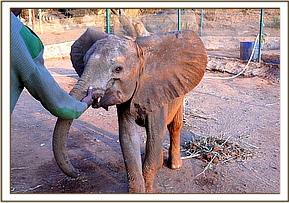 On arrival the Keeper Dependent Orphans’ Matriarch, Loijuk, lavished boundless love and attention on the newcomer who calmed down instantly, and soon the new orphan had settled down and even accepted milk and water from the Keepers all the while watched by an interested group of visiting wild elephant bulls who had turned up to drink at the Stockade water trough. Later on the Senior Independent Ex Orphans arrived to welcome the newcomer into the fold, all crowding around, rumbling and laying trunks lovingly across her back. A make shift stockade was hastily built so that the calf could tame down adequately before being able to join the other orphans. It was important that she became totally comfortable feeding from the keepers first, so that once she did join the Ithumba orphans, free from the confines of the stockades, she would have enough confidence to take her bottle from the Keepers during feed time along with the others.