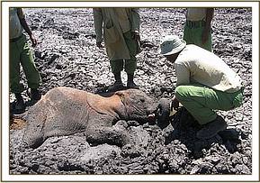 During the morning of the 25th September, Head Elephant Keeper Benjamin, based at the Ithumba Elephant Rehabilitation Unit in Northern Tsavo East National Park, happened to be taking rocks by tractor to the Ithumba Dam where the Trust has recently sunk another borehole to alleviate the ongoing dry season water crisis which always presents us with a huge headache. Having reached the dam, he noticed that an elephant calf was hopelessly bogged in the black cotton clay of the dam’s receding water level. The calf had obviously become stuck in the black cotton mud during the night, since it had not been there when Benjamin deposited another load of rocks the previous day.