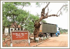 Rumbles and cries echo gently from the stockades of matriarchs Mutara and Shukuru who sense the imminent departure. All this is made all the more remarkable when one remembers that Layoni just a few months previously was a wild elephant living in the wilds of the Masai Mara before his mother was speared and as an orphaned calf he was badly mauled by hyenas. Now with his wounds completely healed and in such a short time Layoni himself a trusting member of the Nursery team one could be forgiven in thinking he had been around for years. Smiling triumphantly the spirited Keepers bid the young travellers farewell, eager for them to get on the road to miss the relentless traffic of Nairobi. The three of the Nairobi Keepers who have been chosen to accompany the orphans on this journey and stay with them in Tsavo, jump enthusiastically into the trucks corridor offering comforting hands through the bars, which are stroked lovingly by the youngsters. More goodbyes and good lucks are called and the elephant-mover lurches to life and passes through the Nursery gates heading out of the Park, along the quiet roads of Nairobi and south towards the wilds of Voi in Tsavo East National Park. Leaving the chaos of Kenyas capital city behind the three orphans follow the weaving Nairobi-Mombasa highway south, cruising through vast plains and up into rolling hills where the road descends a thousand feet into a dryer climate. The flora soon morphs into stretches of commiphora vegetation rooted in red soil and dotted with muddy water holes glinting in the ochre sunrise. The northern end of the Chyulu Hills soon becomes a major focus of the journey as the young calves continue further south on their adventure, passing villages and maize farms hidden amongst towering forests of baobab trees. The entourage consists of the Truck, followed by two landrovers with Daphne, Angela and Robert Carr-Hartley accompanying the move. After three hours and just past half way, the elephant-mover pulls gently to the side of the road and the Keepers jump out and disappear into thick bush. Whilst the orphans wait impatiently, their trunks reaching anxiously through the partitions, the Keepers reappear carrying armfuls of gruere; a lush vegetation that all elephants cant resist. Climbing back into the truck the gruere is divided between the excited orphans who eagerly devour every last piece. Heading on the elephant-mover stops once more to refuel at a small village called Makindu; the station attendants and locals curious about the extraordinary cargo on-board. But without delay the truck gets back on the road, keen to get its passengers to journey's-end before the scorching heat of the noon sun. With Tsavo stretching into the distance, the road continues to follow the misty slopes of the Chyulu Hills with Kilimanjaro veiled in the clouds behind. The green and rocky hills of Voi are soon insight as the truck curves off the highway towards the Voi Gate and into Tsavo East National Park; the Nursery orphans have finally reached their destination.