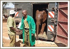 Over the years, it has become a familiar sight – huge trucks parked against the Loading Bays at the Trust’s Orphaned Elephant Nursery in Nairobi, days before the intended departure date, with those orphans due to be moved to the Rehabilitation Units in Tsavo, being coaxed to cooperate by a Keeper armed with a bottle of milk standing inside the vehicles