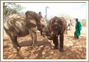 It was a hellish journey. One vehicle broke a gearbox bolt, which had to be replaced en route, necessitating a hold-up. (Thank heavens for practical menfolk!) Then the other got stuck near Kasala not far from their destination where a shower of rain had turned the newly graded road into a mud hole. But, eventually, after a 9 hour road journey, the two elephants from the Nursery arrived at the Un-Loading Ramps at the Ithumba Stockades, where they calmly walked out looking remarkably relaxed, enjoyed a bottle of milk and then wandered around the compound. Soon, the younger Ithumba orphans arrived in a rush, and sure enough, Sian and Loijuk knew Kamboyo and Zurura instantly. Whilst they were greeting their Nursery friends, the others rushed to the open trucks just to make sure no-one else was inside. Then came the older group with Yatta, the Matriarch, Mulika, Nasalot and Kinna in the lead followed by all the others. Immediately, Mulika decided that she wanted them as her own, enveloping the newcomers with her trunk, caressing them by laying her trunk against their backs and gently puling their heads towards her. As always, it was a very touching scene and the warmest of welcomes for Kamboyo and Zurura, who took it all in their stride. That night they happily went into their new Night Stockade along with Sian and Loijuk to keep them company, it first having been inspected by all the others who obviously anticipated this exciting event. Surprisingly they seemed to know all about the electrified “hot wire” surrounding the Stockade, for they were careful not to approach, or touch it. Obviously, in silent elephant telepathy, the others must have cautioned them about it!