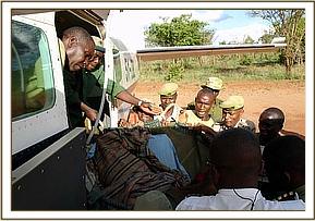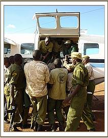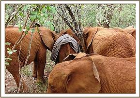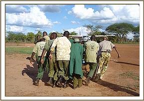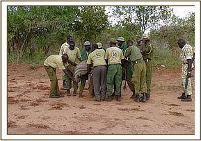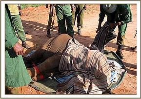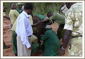 He looked thin, and was obviously an orphan of about 6 – 8 months old. Having completed their business in the nearby town of Mtito Andei, they returned to capture the orphan, who was still in the same place and who did not put up much of a struggle. His legs were bound, and he was transported to the nearest airfield at the Kamboyo Park Headquarters of Tsavo West National Park, where he was secured to a tree in a standing position, to await the arrival of the rescue plane on its way from Nairobi and cooled down with wet mud. It is believed that this orphan could be a victim of “problem animal control” having been separated from his mother when a herd of elephants was recently chased out of a nearby Wakama settlement known as Mangaleti.