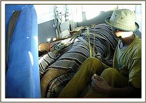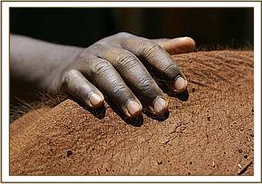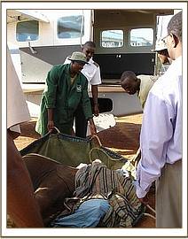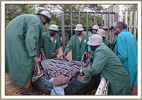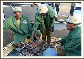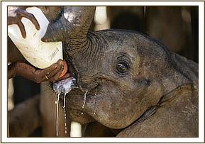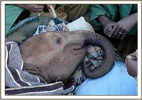 When the rescue plane arrived, with our Keepers aboard plus all the paraphernalia needed to load an elephant into the plane, he was given both a mild sedative injection as well as an antibiotic. There were signs of fluid coming from the mouth and trunk, so upon arrival in the Nursery at about 6.30 p.m., he was also given the homeopathic pillules and a booster antibiotic jab to try and protect him against possible pneumonia, which is a killer of weakened starvation victims whose immune system is depressed. Once unbound, being weak, he was only mildly aggressive towards the Keepers who were with him during the night, but immediately homed in on orphan Kora, in the next door Stockade, extending his trunk and intertwining it with that of Kora, who is quite used to greeting newcomers in the neighbouring Stockade, known as “the taming Stockade”. Throughout the night he interacted with Kora, but rejected his milk. However, in the morning when all the other elephants were brought around to greet him, he accepted milk from a bottle held by a Keeper, and this is always a hopeful sign.