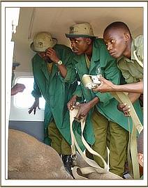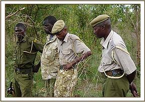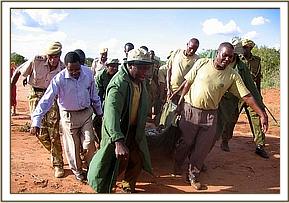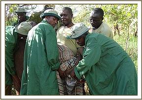 During the afternoon of 28th March 2006, our Mtito De-Snaring Team, on their way to book two poachers arrested in the Tsavo Triangle, came across a lone young bull elephant calf crossing the road about 4 kms. from the Triangle Park Mtito Entrance Gate.