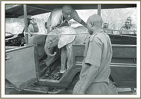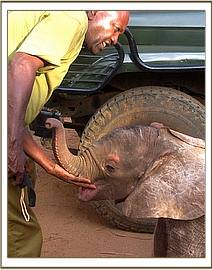Galdessa Camp is a tented Lodge on the South Bank of the Galana River, popular with Italian tourists from the North Coastal resort of Malindi. During a game drive after lunch on the 21st September 2009, a lady (who happens to be a foster-parent of our orphan Shimba), spotted a tiny elephant calf as they crossed a nearby doum palm fringed dry sand lugga having just left the confines of the camp. The baby elephant was alone, with no other elephants in sight and being just days old, was too young to know fear. The plight of the calf was reported to the Camp staff. Later Rick and Nicole Goodfellow who were guests at Galdessa went in search of the orphaned baby and once located he seemed desperate for company, and ran up to the car, since in a perfect world a newborn elephant should never be alone, but surrounded by its elephant mother and a very loving elephant family, all of whom would fondle, protect, and lavish love on any new family arrival. He was rescued and immediately taken to Galdessa Camp in the back of the game drive vehicle. The Kenya Wildlife Authorities and the David Sheldrick Trust were alerted that an elephant rescue was on the cards to save this tiny orphan.