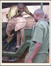 The little elephant was desperately thirsty, gulping down the water by mouth as two men held the bucket, too new to know how to use its trunk. The Rescuers well meaningly suggested feeding it milk, but being already a foster-parent conversant with the Sheldrick Trust’s website, Camilla Caccia advised them against this, knowing that cows’ milk kills elephant babies. He remained in the back of the car for the next 1 ½ hours awaiting the arrival of KWS and the Sheldrick Trust Keepers from the Voi Stockades, who took possession of the little elephant and drove him back to the Voi Stockades for the night where it was given elephant formula milk.