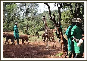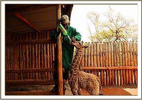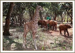 Found wandering alone, Kili was rescued in August from the foothills of Mount Kilimanjaro by the Kenya Wildlife Service (KWS) Vet Dr. Njoroge, who heads the DSWT/KWS Amboseli Mobile Veterinary Unit. He has since settled extremely well at the Nairobi Orphanage, where our keepers have adapted to caring for a baby giraffe, alongside 30 infant orphaned elephants.