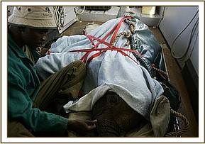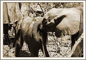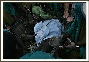 Once back at the nursery things did not look promising at all, however the positive was that despite being desperately weak and emaciated she did take her milk. The next day was touch and go as her temperature plummeted, and her trunk became damp with liquid coming from her lungs, both behind her ears, and her trunk icy cold. We brought the other orphans to her, and immediately they tenderly wrapped their trunks around her, all of them terribly concerned about the little newcomer. This seemed to be all she required and her eyes immediately brightened and she began the fight to live. We are hopeful that this beautiful gentle little girl has surmounted enormous odds and will be counted amongst our successes, but it is still early days.