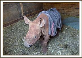 It’s hard to believe that the Trust’s tiny rhino miracle named “Maalim”, who arrived in the Nursery as a miniature, and who celebrated his 1st birthday on the 17th December 2009 is, in fact, the same animal that came in when just 2 days old just over a year ago. Undoubtedly born premature, he was immediately abandoned by his rhino mother and rescued by a KWS Ranger of the same name. A caravan aircraft was sent down to collect “an orphaned rhino calf” about whom we had been alerted, so imagine our surprise when a curious specimen who could have fitted into a lady’s handbag arrived in the Nursery! We never expected such a prem baby who should still have been in his mother’s womb to even survive, let alone thrive, but thrive he has from day one, and today is a very sturdy perfectly normal rhino yearling with passion for a Mattress!