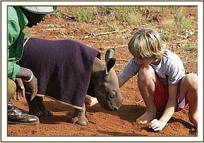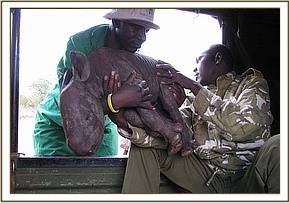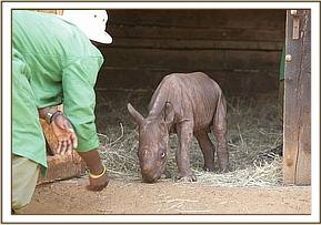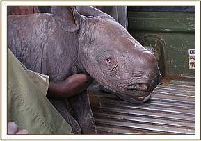 He was literally only a day or two old when he was found by a Ranger of the same name during a routine patrol of the Sanctuary on the 18th of December - a tiny bundle that looked more like a baby warthog than a rhino with no sign of a mother anywhere near. He was left for a day to see if his mother would retrn, but by evening the calf was very weak, so Ranger Maalim carried him back to the Ranger Base and alerted the Senior Warden Tsavo East who in turn got a message to us that a rhino calf was in urgent need of the Trust’s help and input. It was requested that we take over the little rhino, to save his life and also requested that he be named “Maalim” in honour of the Ranger responsible for rescuing him.