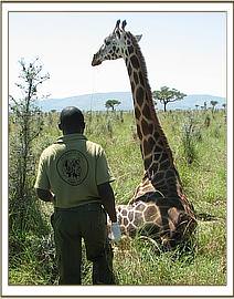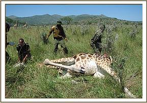 Early the following day without even breakfast we set out to the park looking for the snared animals. First to be spotted was a young mother with a tiny calf barely a few days old. She was limping really badly but after a long assessment, we ascertained that she had no metal snare on her and her problem was a dislocation on her hipbone which may have been caused by putting her foot in a hole at full gallop. She seemed to be in a lot of pain but after a long and careful assessment we agreed it best not to intervene in any way since anaesthetizing her would most likely stress her further. Most wild animals easily succumb to such stress and giraffes are no exception and that would leave the young calf with no mother, no milk and therefore no hope for survival. Nerves heal slowly given a chance, so we all wished her a quick recovery.