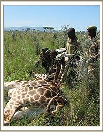 It was the third weekend of the month of January in the new year 2010. The vet unit members based in the Mara had agreed to spend the day cleaning and clearing the grass around the camp which was sprouting up really fast due to the heavy rains pounding the area. As usual, without any warning we received a call from the warden in charge, Ruma National Park which is situated on the shores of Lake Victoria, in Western Kenya, concerning two endangered Rothschild giraffes that had Wire snares on them and required immediate veterinary attention to save them from the pain or even eventual death. But the distance involved was long and the roads not so smooth so we all agreed it best to organize ourselves for the journey which would take place first light the following morning. We set out early the following day for the long, tedious and bumpy ride and after eight hours of driving we finally arrived in Ruma Park headquarters and the warden welcomed us and informed us that he had seen the snared Long necks in the morning. We decided to take a rest for the evening and attend to the animals the following morning since darting an animal in the evening is very risky in many ways to the persons involved and the animals too.