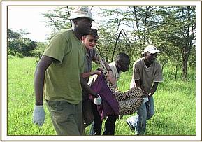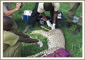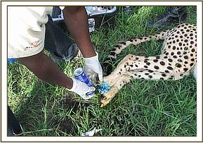 The extent of the limp necessitated anesthetization to further examine the injury and determine the best treatment regime to administer to the Cheetah. We quickly divided ourselves into two groups, the darting and treatment group and the second group was to keep an eye on the cub to make sure we did not loose it in the thickets because it would be easy prey for the other carnivores if separated from its mother. After darting, the examination revealed a cut on the main toe and this is what made it difficult for her to walk. We suspected that she was trying to defend the cubs when she got injured and probably lost one of the cubs leaving her with only one. This is what prompted her to move away from the Talek area that has a high population of Hyenas into the safety of Olare Orok Conservancy that teems with good numbers of herbivores.