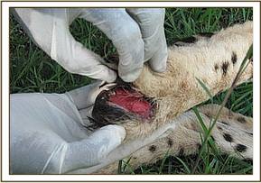 The number of Cheetahs (Acinonyx jubatus) in Kenya is not well known and it is estimated to be between five hundred and one thousand according to studies conducted in the national parks and reserves. The numbers of this beautiful medium sized carnivore have been declining even further due to a number of factors which include but not limited to; Continuous loss of Cheetah habitat and their preferred prey species due to the burgeoning human population. This in turn has led to the few remaining ones preying on shoats (goats and sheep) and thereby prompting retaliation from angry livestock farmers who hunt them down with bows and arrows or lace the livestock carcasses with poisons killing even other unintended scavenger species. Cheetahs sharing a home range with other carnivores face stiff competition from especially Lions, leopards and Hyenas. They become a target and usually get injured or even killed by these bigger cats. Effects of tourism activities such as loud talking, shouting, use of radio communication by tour drivers and many off-road driving. Sarcoptic mange infestation and numerous injuries due to predation, snaring, or injuries inflicted by prey while hunting. The Masai Mara national reserve is considered to hold a sizeable number of the remaining cheetahs in Kenya. The undulating savanna grassland that is the Mara offers the ideal environment for cheetahs to flourish. But the numerous other carnivores present in this ecosystem is a big threat to the Cheetah and various strategies are being implemented by the various stakeholders to halt the decline and ensure that this important species continues to thrive in the wild. Cheetahs rely on speed to catch their preferred prey like Thomsons gazelles, impalas, young to sub adult warthogs, young wildebeests and sometimes Grants gazelles. They therefore have to be fit, strong and able to outrun all their prey in order to have a meal. When a Cheetah therefore gets a leg injury that should send alarm bells ringing to wildlife managers and conservationists that urgent action need to be taken to treat and make sure that the animal is fit enough to survive in the wild. When the Mara vet unit got a call about a limping female cheetah seen with two cubs aged about two months, we got very concerned and started to aggressively search for her in the Talek area of the Masai Mara Nat reserve where she had been seen. Two days later, the Olare Orok Conservancy manager a Mr. Rob and his wife Sarah reported to the Vet unit seeing a Cheetah limping on the right hind leg. When we went searching, we found the Cheetah with only one cub tucked under thick acacia scrubs on the banks of a stream flowing through the conservancy. She was very calm in our presence and the cub tried to prompt the mummy to get away from our approach but she remained very calm even after we prompted her to walk a little bit so we could see the extent of her injury. When she did, it was evident that she could not put any weight on the injured right hind leg.