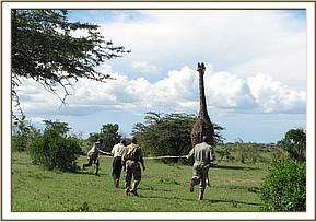 Once we got there the immobilization drug was quickly prepared and the giraffe was darted. By the use of a binocular, one could tell the full dose had discharged and ten minutes later the giraffe was fully narcotized and the capture ropes came in handy for the vet unit to rope the animal down. Once down, the long spear was pulled out and the wound cleaned thoroughly and disinfected. Intramuscular antibiotics were administered too and the giraffe was revived. He stood up in two minutes and ran to join the family members who were browsing on some nearby Acacia tortilis trees.
