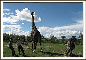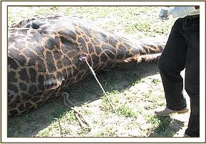 Giraffe immobilization is tricky in that the animal cannot go down on its own. That’s why and where the capture rangers come in handy by roping the animal down and to keep it down the head has to be held down to avoid it standing up or in so trying smash its head down. Again due to the long neck and location of the brain, the animal’s respiration and thermoregulation are affected by the anesthesia and therefore the operation has to be very fast and immediately administer the revival drug.