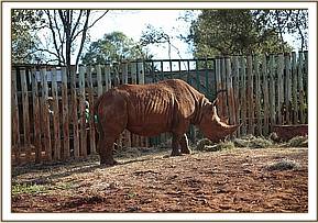 Maxwell quite by mistake ended up having a great adventure in the early hours of Tuesday 16th April. It is a mystery how the bolt on his stockade chain came loose to the extent of falling away completely causing his stockade side door to open presumably as he leaned on it. Solio, the female rhino orphan who is now free to come and go as she pleases, had been back to the stockades between 6pm and 9pm the previous evening and perhaps Maxwell while having contact with her had pressed again and again against the door causing it to slowly come loose. Luckily she was long gone by the time Maxwell made his escape or he could have followed her far out into the Nairobi National Park. There he would have been at the mercy of other aggressive male rhinos, who would have perceived him as a threat, being unfamiliar to them, or at risk from Nairobi Park predators or dangerous unknown terrain. The torrential rain had also resulted in some fast flowing streams which, from his tracks, it appears Maxwell was reluctant to cross. Instead he made his way back towards the familiar smell of his midden, where the keepers deposit his dung from the stockade, and towards the various delights of Daphne Sheldrick's garden.